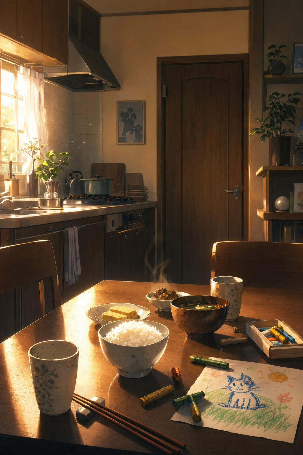 Static LS. Warm apartment kitchen at dawn. Rice bowls and tea cups sit on the table. Crayons and a small drawing are still there from breakfast. In the background, the apartment door is closed and chained, but the frame has a fresh vertical crack from last night's forced entry. The crack stays visible behind the table. Nobody is in danger now. The room is normal because someone else was awake.