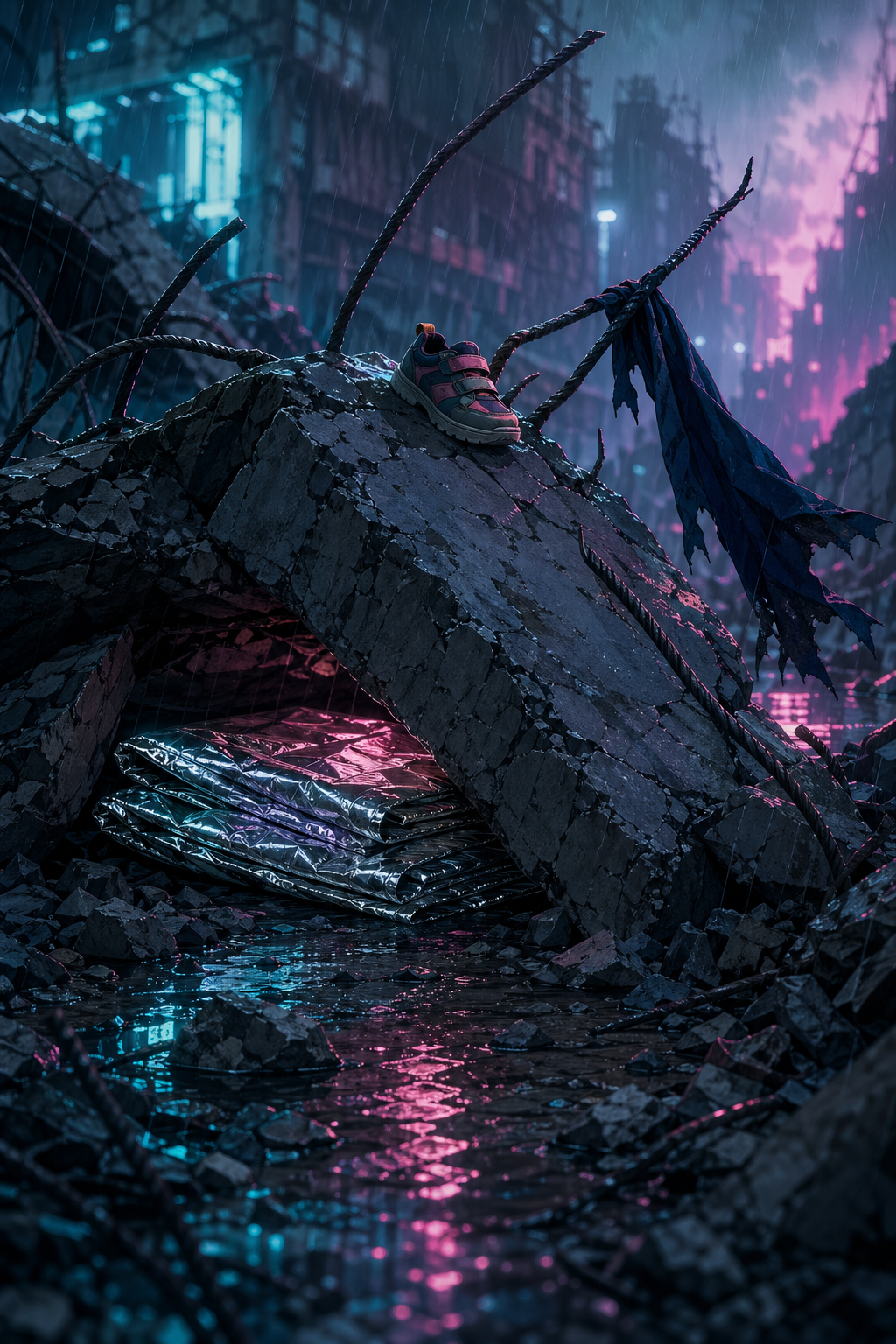 HARD CUT. Static MS. Rain on collapsed concrete. Rebar sticks out. A cleared pocket beneath the slab holds a folded emergency blanket. A small shoe sits on top of the rubble as a marker. A dark navy fabric scrap is caught on the rebar above it. The shoe stays on the rubble. The fabric stays on the rebar. The rescue already happened. Only evidence remains.