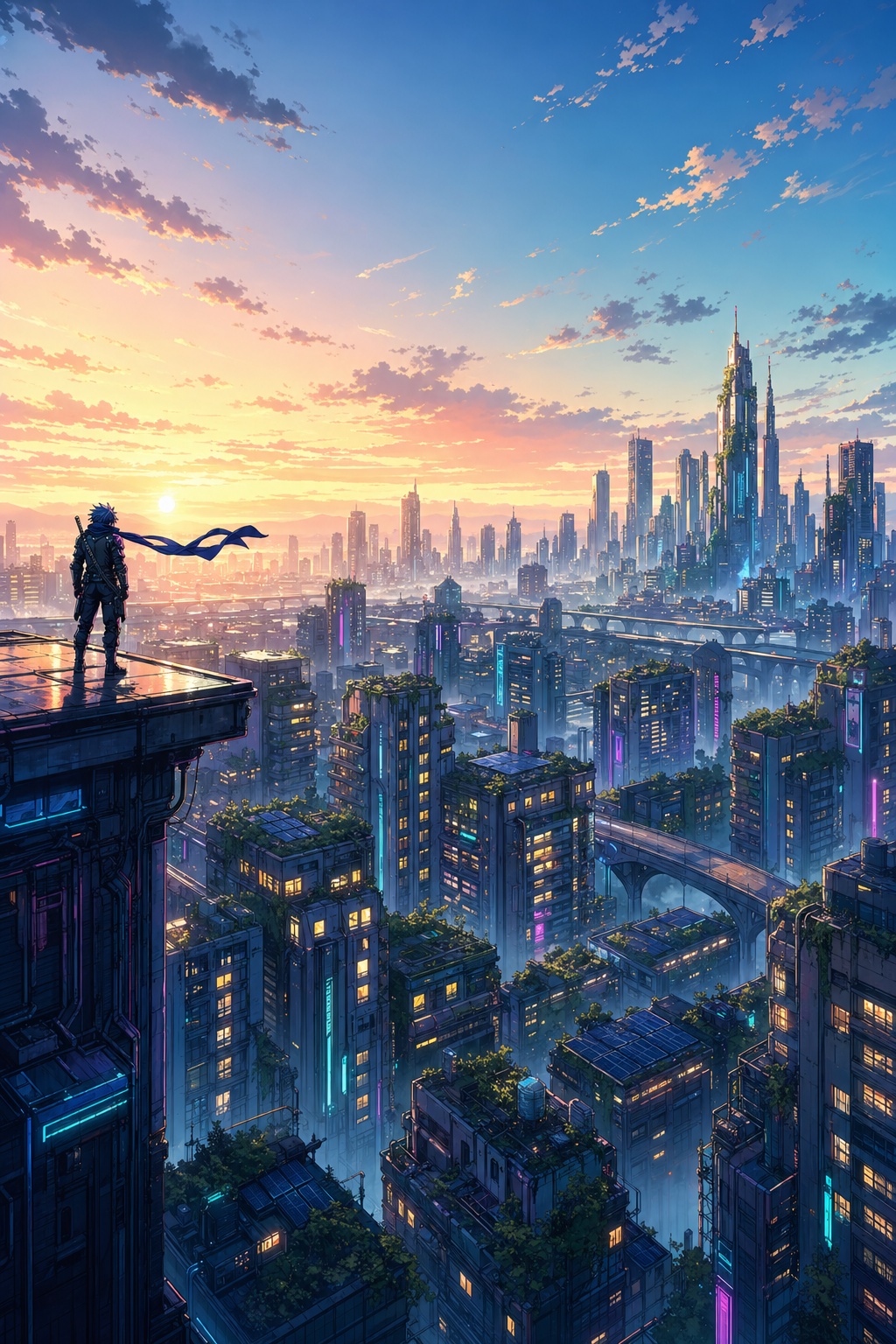 HARD CUT. Static rooftop skyline. Far left: Blue Razz, tiny, back to camera, navy/cyan silhouette, scarf trailing right in morning wind. Neon signs below power down one by one. Apartment windows turn on one by one. He does not move. He has been awake all night. The city starts its day.