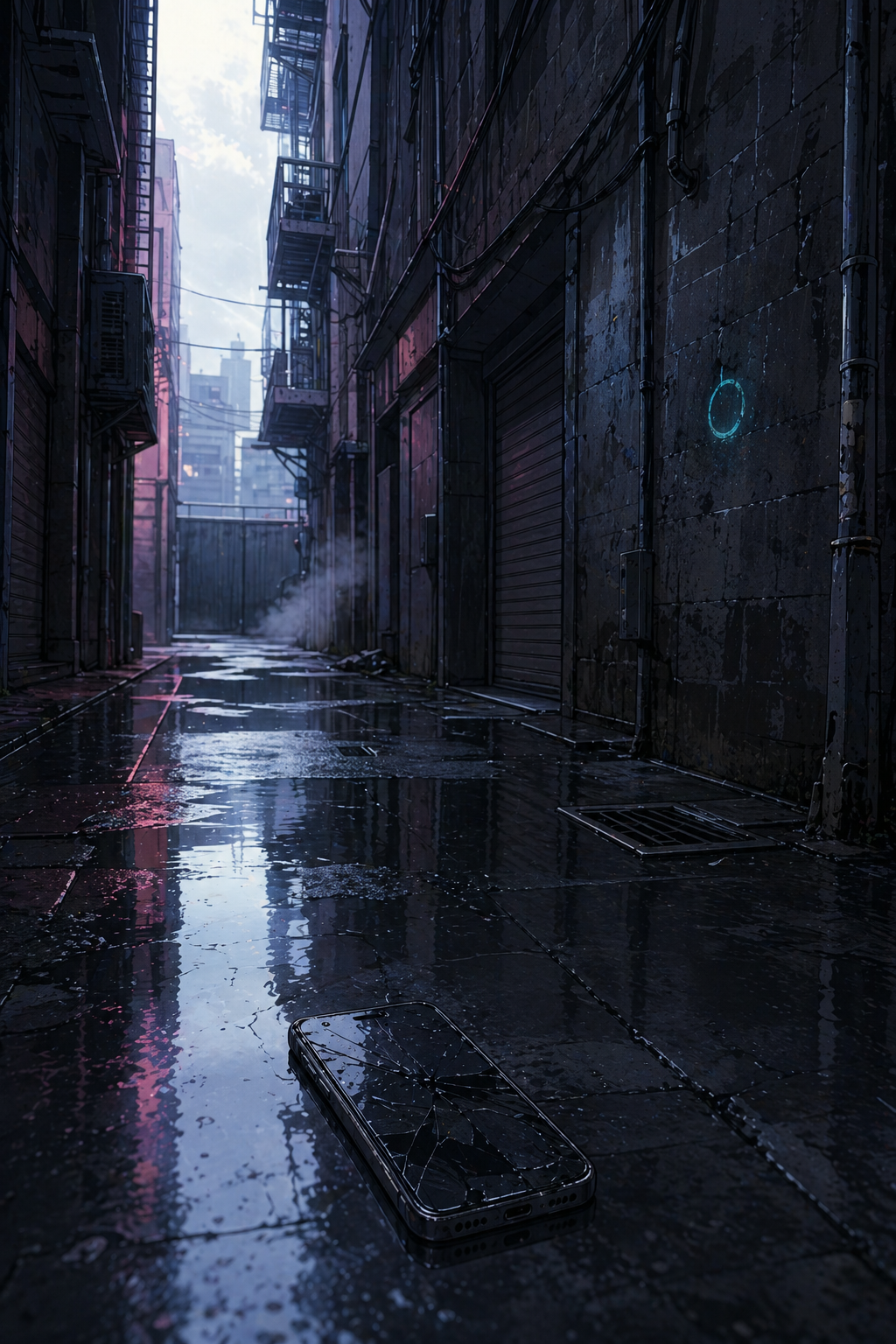 HARD CUT. Static LS. Morning alley from the kid rescue. Empty. The cracked phone lies on wet asphalt, screen dark. A small circular cyan scorch mark remains on the wall. Puddle reflects grey sky. No Blue. No thug. No kid. The phone stays where it fell. The mark stays on the wall.