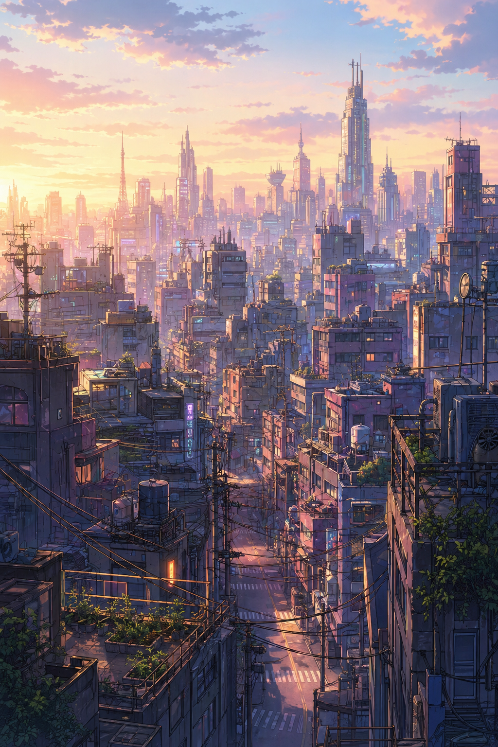 HARD CUT. Wide dawn skyline. Soft gold behind rooftops, power lines, steam vents. No hero visible. Most windows still dark. A few lights turn on. The city sleeps because he did not.